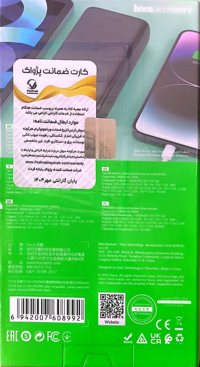 پاوربانک هوکو مدل J121A 22.5W ظرفیت 20000 میلی آمپر ساعت
